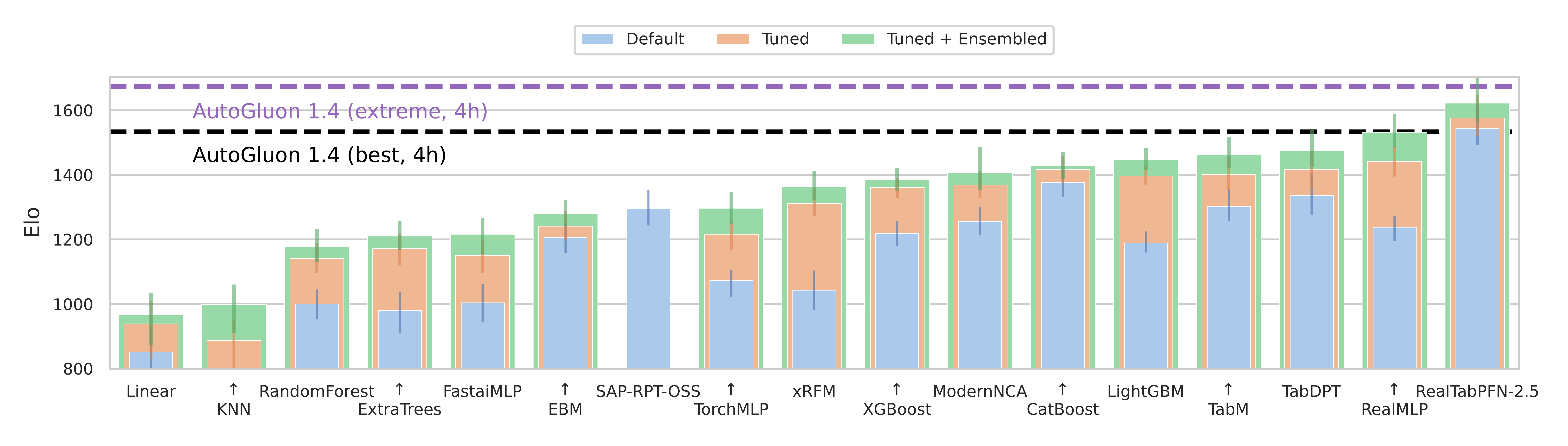 As of March 2026, the TabArena leaderboard shows some interesting patterns. Here are the ELO rankings for tested models using default, tuned and tuned + ensembled versions of each model type: